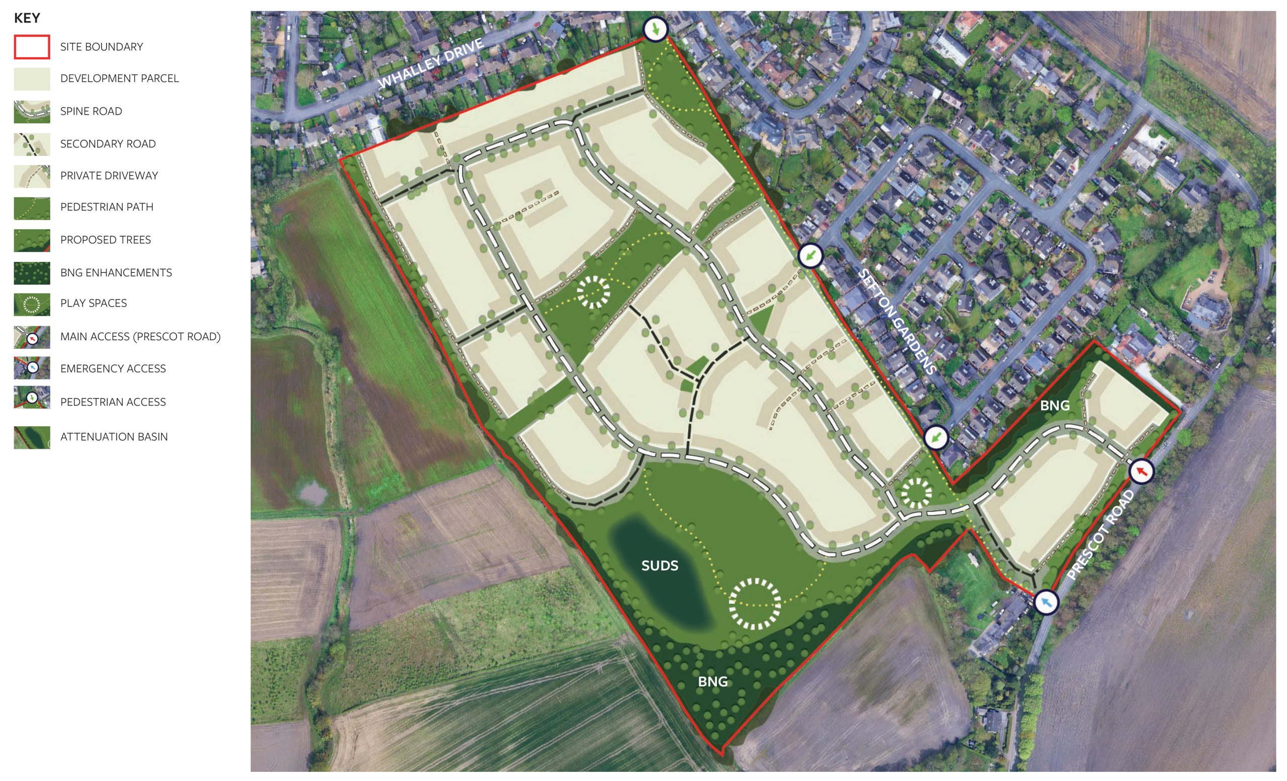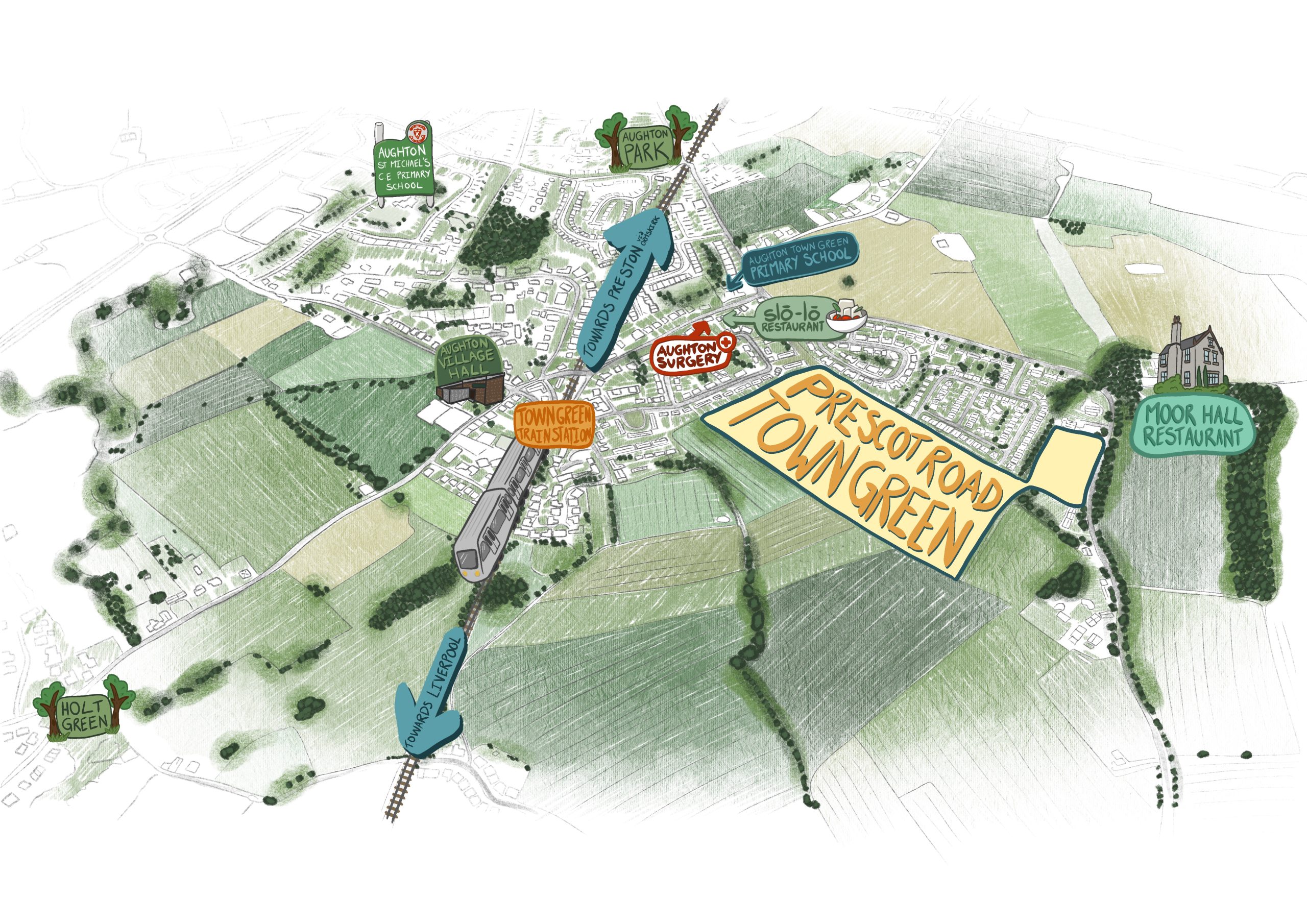 The site is located off Prescot Road, adjacent to the Town Green community, with primary vehicular access from the southeast. Pedestrian routes will connect to Town Green, providing convenient access to the wider local area.